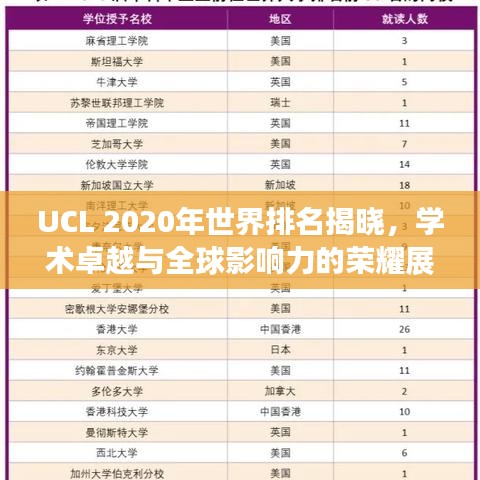 随着全球化的不断发展,高等教育机构的国际排名逐渐成为评估学校综合实力、吸引优秀学子及研究资金的重要指标之一,作为世界知名的高等教育殿堂,UCL(University College London)在2020年的世界排名中再次展现出其卓越的学术实力和全球影响力,本文将为您详细介绍UCL在2020年的世界排名及其背后的学术成就。